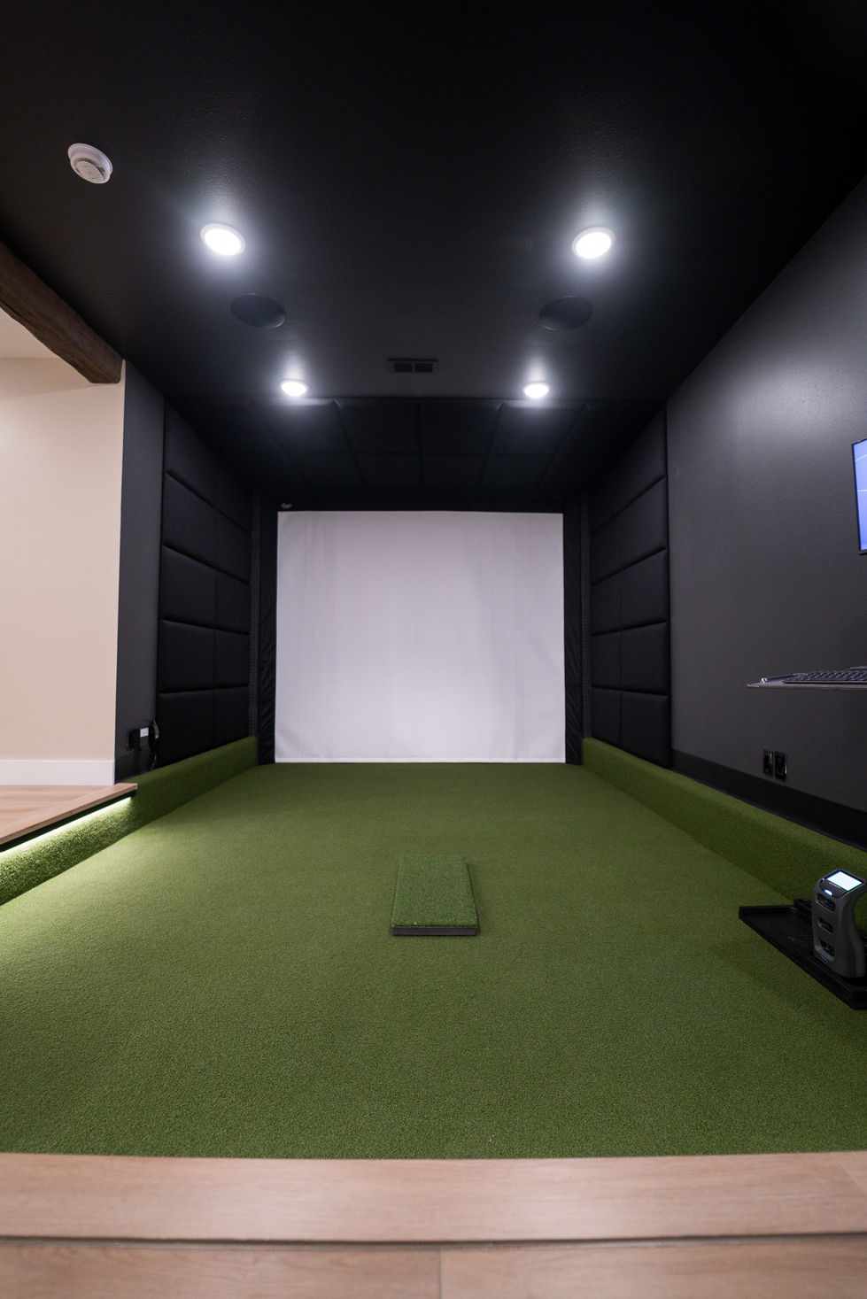 Immerse yourself in our indoor golf simulator room projects featuring green turf flooring, screen, and a realistic setup for golf enthusiasts to enjoy. Experience the luxury of having your own golf simulator at home.