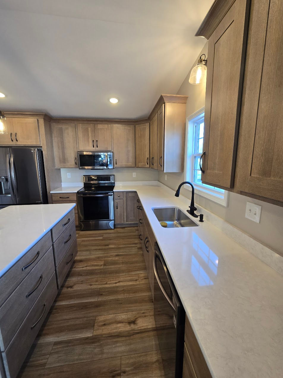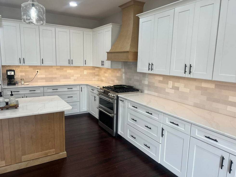 Explore our modern kitchen renovation projects featuring dark cabinets, marble countertops, white subway tile backsplash, and stainless steel appliances. Our designs also include islands, wooden flooring, and gold pendant lights for a touch of elegance.